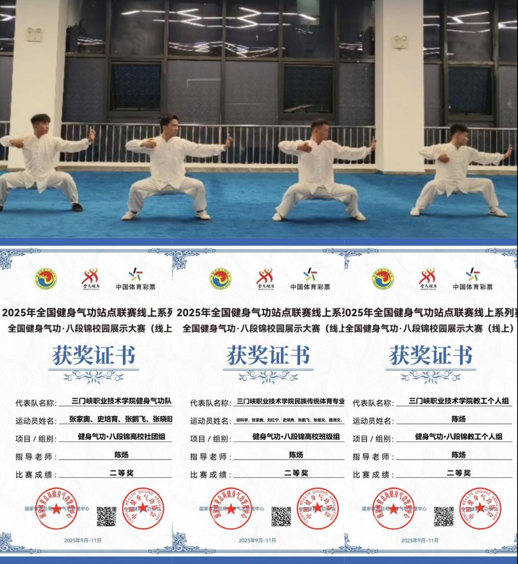 近日,由国家体育总局健身气功管理中心与中国健身气功协会联合主办的“2025年全国健身气功·八段锦校园展示大赛(线上)”圆满落幕。学院选派的2支学生队伍与1支教师队伍凭借规范流畅的动作、默契十足的配合和神形兼备的演绎,均荣获大赛二等奖,彰显了学院师生在民族传统体育领域扎实的专业素养与良好的精神风貌,更展现了“以体育人、以文化人”育人理念的丰硕成果。
